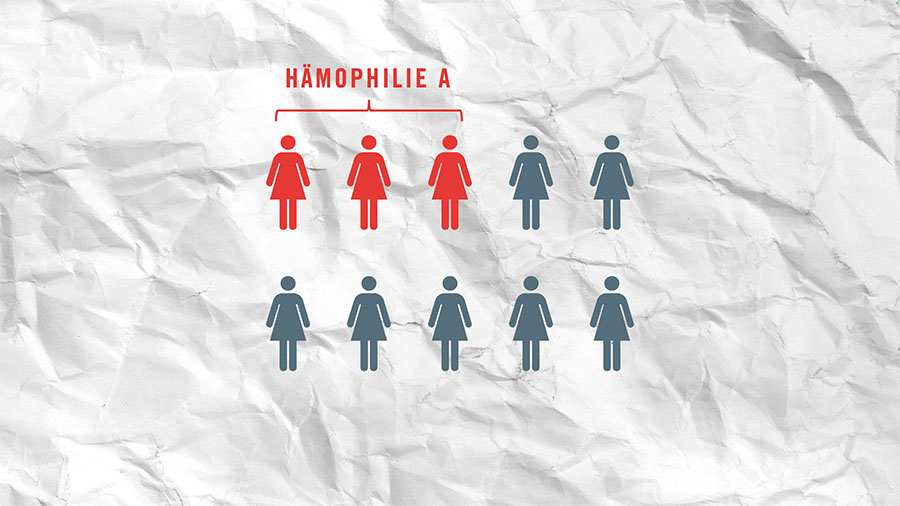 Tuttavia, esiste una errata consapevolezza, particolarmente radicata, riguardo all’emofilia, spesso considerata una «malattia maschile». Come nella malattia di von Willebrand, una mutazione genetica compromette la coagulazione del sangue e le persone colpite presentano un aumento della predisposizione al sanguinamento. Ciò vale sia per l’emofilia A (deficit di fattore VIII) sia per l’emofilia B (deficit di fattore IX), che è circa quattro-cinque volte meno comune. In entrambi i casi il gene mutato (F8 o F9) si trova sul cromosoma X e poiché gli uomini possiedono un solo cromosoma X, se ereditano una mutazione nei geni F8 o F9 (responsabili dell’emofilia) svilupperanno sempre la malattia. Le donne hanno due cromosomi X. Se uno dei due presenta una mutazione nei geni F8 o F9, si parla di portatrice della malattia. Le donne portatrici tendono a manifestare sintomi meno gravi rispetto agli uomini, possono comunque soffrire di disturbi della coagulazione e di sintomi debilitanti, come mestruazioni estremamente abbondanti, una coagulazione rallentata dopo ferite o interventi medici e frequenti ematomi.
